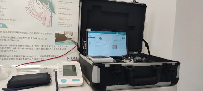 除了SH-T17智能健康一體機(jī),健康中心也配置了SH-202便攜式健康一體機(jī),SH-202便攜式健康體檢一體機(jī)是上禾針對(duì)基層公衛(wèi)推出的一款便攜式公共衛(wèi)生檢測(cè)設(shè)備,可以通過(guò)平板電腦等數(shù)據(jù)采集終端和數(shù)據(jù)管理軟件系統(tǒng)實(shí)現(xiàn)一體化整合,實(shí)現(xiàn)心電圖、心率、血糖、血壓、血氧飽和度、尿常規(guī)、體溫等多種參數(shù)檢測(cè),快速建立居民電子健康檔案,與信息管理平臺(tái)或健康檔案管理系統(tǒng)進(jìn)行數(shù)據(jù)交互傳輸,可上傳或成批次/單獨(dú)下載調(diào)用數(shù)據(jù),并提供接口開(kāi)發(fā)包,支持將采集到的健康數(shù)據(jù)上傳至區(qū)域信息平臺(tái)或健康檔案管理系統(tǒng)。