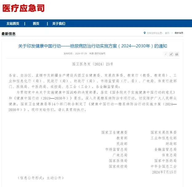 近日,由國家衛生健康委等14個部門聯合制定的《健康中國行動-糖尿病防治行動實施方案(2024-2030年)》發布,重點強調了9個方面的24條主要措施。